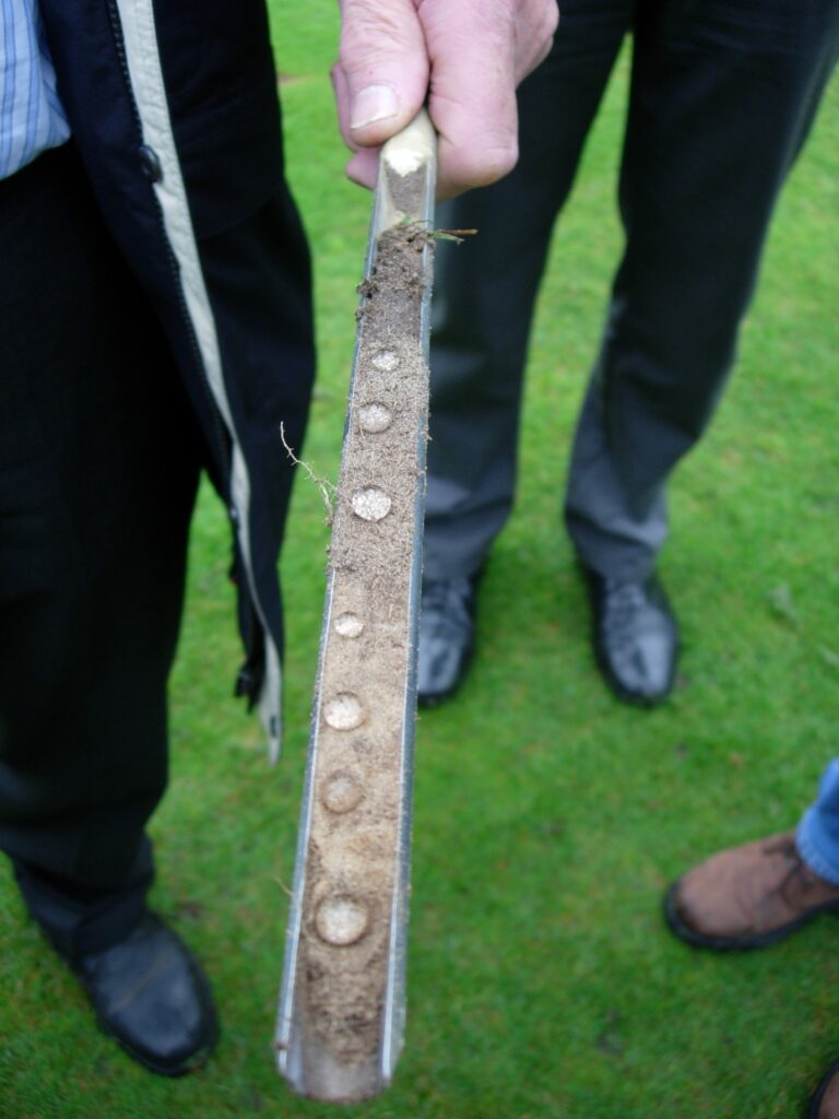 The symptoms associated with hydrophobic soil may not be expressed early in the year but the conditions that cause them may still be present in the soil profile. We know that hydrophobic soils are re-wettable and often this occurs naturally over the wetter winter months. The taking of cores, drying them out and carrying out a simple water drop penetration test (WDPT Letey, 1969) can indicate whether the hydrophobic-causing conditions have persisted through the winter. Using a soil probe, collect soil samples and air-dry them at room temperature for two weeks. Cores must be completely dry to determine the degree of soil water repellency. Place water drops at 1cm intervals along the soil core as exhibited in Figure 1, time how long they take to move into the soil core.